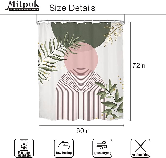 Pink Sage Green Boho Shower Curtain 60Wx72H Mid Century Modern Abstract Gold Leaves Plant Sun Bathroom Decor Minimalist Geometric Arch Line Aesthetic Bath Curtain Fabric Polyester 12 Pack Hooks