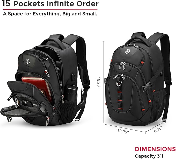 Swissdigital Design Laptop Backpack with USB Charging Port, Travel Backpack Fits 15.6 inches Computer, 31L College School Backpack for Men, Black | SD803