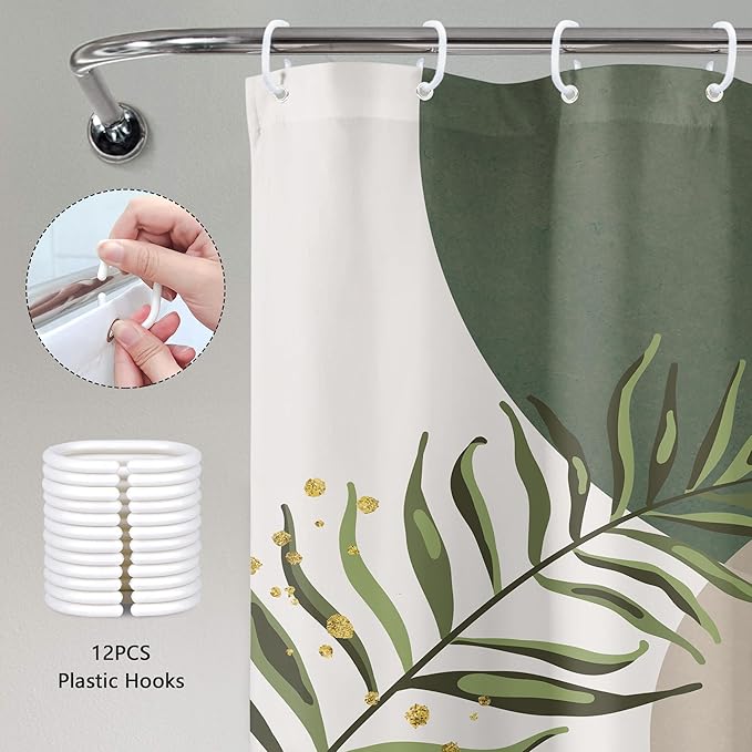 Green Boho Shower Curtain 72Wx96H Extra Long Mid Century Modern Abstract Green Gold Minimalist Leaves Sun Arch Bathroom Decor Geometric Plant Bath Curtain Fabric Polyester 12 Pack Hooks