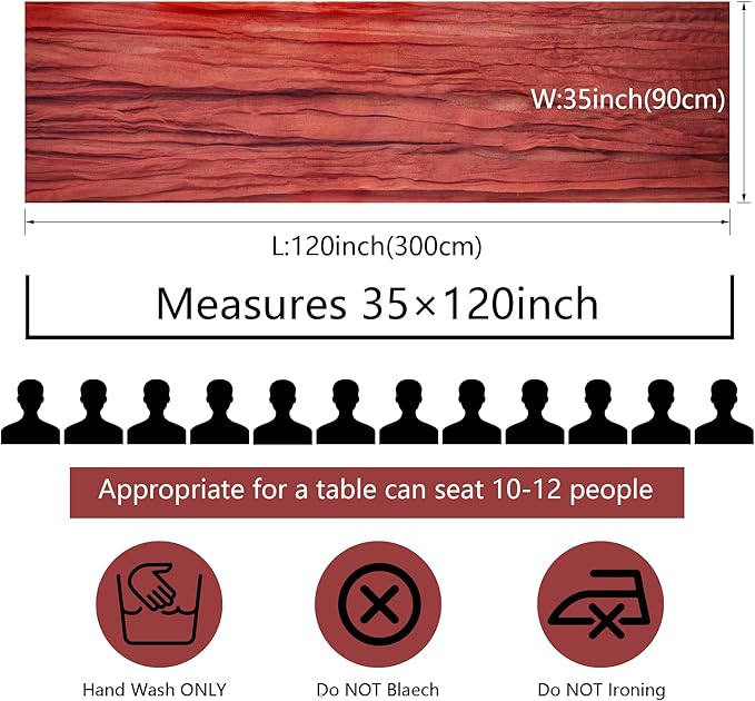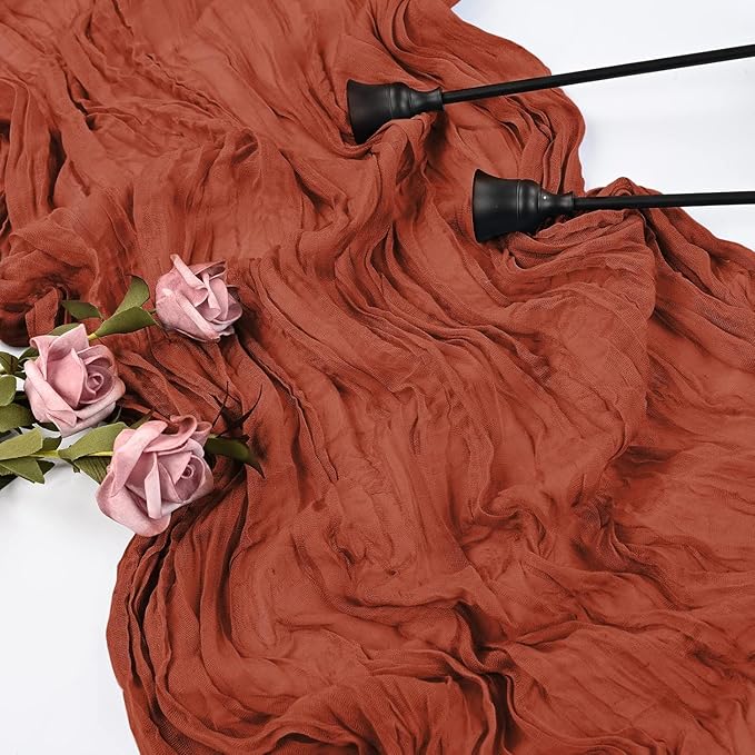 - Multipurpose Table Runner: This terracotta cheesecloth tablecloth has an elegant look and creates a vintage home décor look. Great for various events, such as wedding, banquets, birthday party, bridal and baby shower, dessert tables, weddings arch, theme party, Christmas, Valentine's Day, Easter, Thanksgiving and many more special occasions. The cheese cloths is not easy to warp or fade, no ironing is needed to keep the pleated texture, Can be free to wash and use it again and again