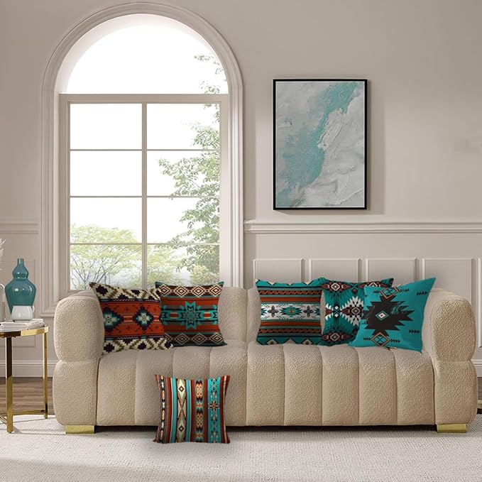 Western Throw Pillow Covers Set of 6, Southwest Aztec Mexican Turquoise Home Decor Ethnic Tribal Navajo Outdoor Couch Decorative Cushion Case 18"X18"