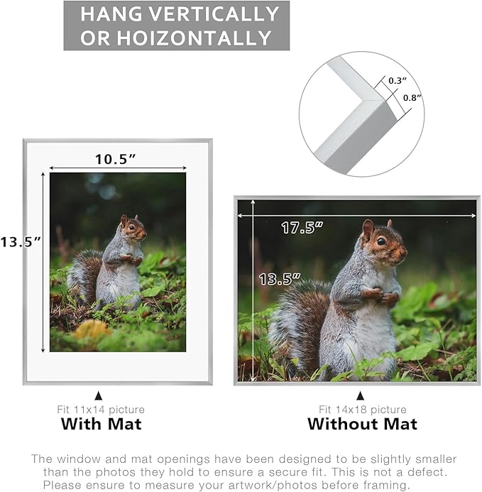 - Can Display:Each 14x18 frame includes a removable Mat (opening size: 10.5"x13.5"), fits for 11 x 14 picture print (with Mat) or 14 x 18 poster (without Mat)