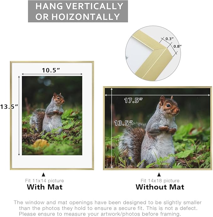 - Can Display:Each 14x18 frame includes a removable Mat (opening size: 10.5"x13.5"), fits for 11 x 14 picture print (with Mat) or 14 x 18 poster (without Mat)
