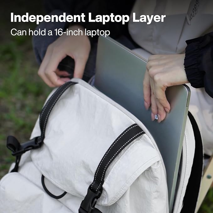 - 【LARGE CAPACITY & WELL ORGANIZED】Portable flip drawstring design allows you to pick up items quickly. The travel backpack has a spacious main compartment with a capacity of 22L, can hold clothes, books, water bottle, umbrella and other items. Independent laptap layer can fit for 16 inch laptap. Two side pockets and one magnetic front pocket can be used to organize essentials or daily necessities. Lots of pockets design make your items organized.