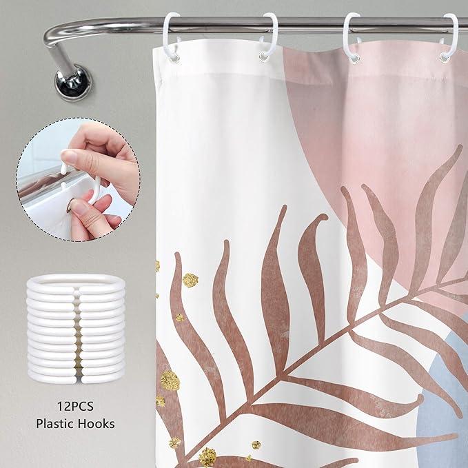 Pink Blue Boho Shower Curtain 60Wx72H Mid Century Modern Abstract Gold Leaves Plant Sun Bathroom Decor Minimalist Geometric Arch Line Aesthetic Girls Bath Curtain Fabric Polyester 12 Pack Hooks