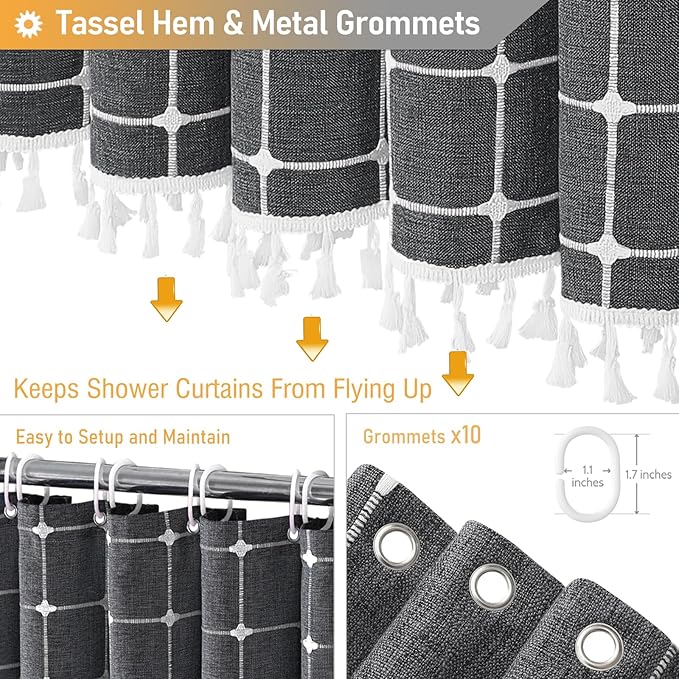- 【Dimensions】: W60xH72 inches(The tassel length is not included); The tassel brings 1.4 inches of additional length; Package includes 1 charcoal grey shower curtain and 10 Plastic Hooks; Various sizes shower curtains meet most bathtubs and shower stalls need. This farmhouse shower curtain is perfect for apartment, hotel, spa, camper, RV, dorm, school shower, athletic club, gym and everywhere else you need a shower curtain.