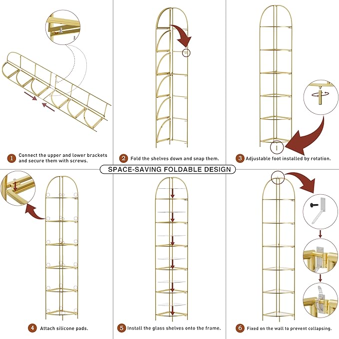 Crofy Foldable 6 Tier Corner Shelf, Metal Corner Plant Stand with Gold Frame and Transparent Shelves, Corner Display Rack Multipurpose Shelving Unit for Living Room, Bedroom, Bathroom