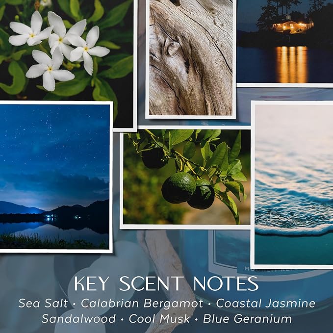 - MOONLIT REFLECTION – A TRANQUIL NIGHT BY THE WATER: Let the calming blend of cool evening air, coastal jasmine, sea salt, and sandalwood transport you to a peaceful moonlit escape or romantic stroll. Hints of sea foam and crisp musk evoke the serenity of still waters and starry skies. This ocean-blue colored candle creates the perfect ambiance for relaxation, reflection, and quiet nights.