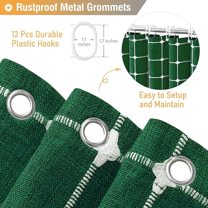 - 【Dimensions】: W72xH72 inches(The tassel length is not included); ❤️The tassel brings 1.4 inches of additional length❤️; Package includes 1 emerald green shower curtain and ★12 Plastic Hooks★; Various sizes shower curtains meet most bathtubs and shower stalls need. This farmhouse shower curtain is perfect for apartment, hotel, spa, camper, RV, dorm, school shower, athletic club, gym and everywhere else you need a shower curtain.