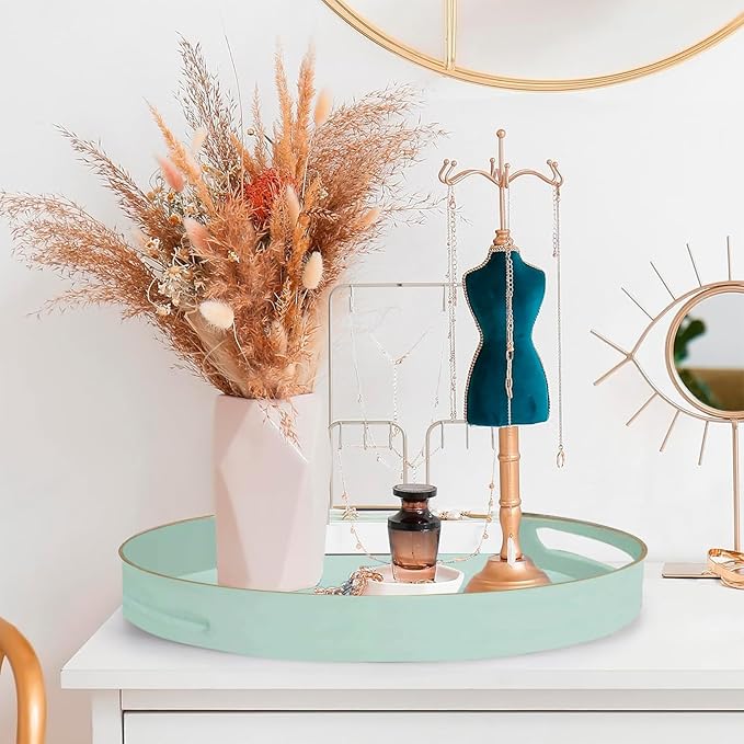 Mint Green Round Serving Tray with Handles,13" Decorative Ottoman Coffee Table for Perfume,Living Room,Home Decor
