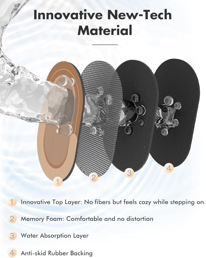 - Super Absorbent & Stain Resistant: Innovative advanced nano porous PU leather surface can absorb dripping water instantly without leaving any watermarks or stains. Super absorbent bath mat in front of bathtub, shower door or sink to keep bathroom floor clean, dry and safe.