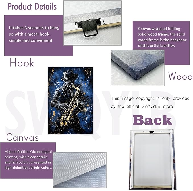 - Black music framed: this jazz painting has been assembled. The design of the canvas surrounding the solid wood frame makes this artwork more beautiful and three-dimensional. It is simple and convenient to hang. You can hang it as soon as you receive it.