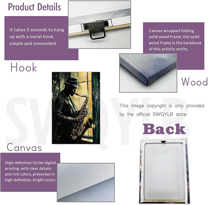 - Black music framed: this jazz painting has been assembled. The design of the canvas surrounding the solid wood frame makes this artwork more beautiful and three-dimensional. It is simple and convenient to hang. You can hang it as soon as you receive it.