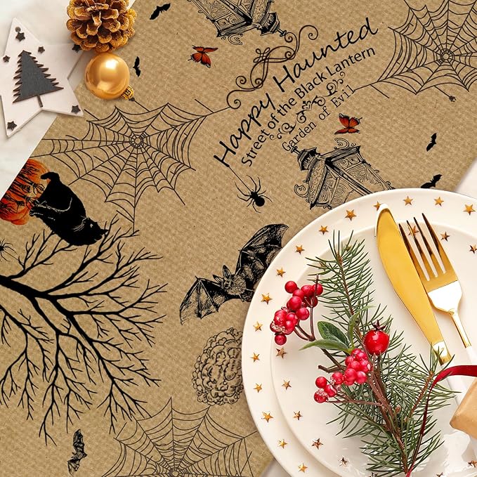 Halloween Haunted Burlap Table Runner Seasonal Spring Fall Kitchen Dining Linen Table Decoration for Indoor Outdoor Home Party Dinner 13x72 Inch