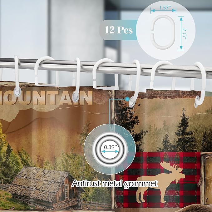 - Cabin Shower Curtain Material: Waterproof polyester fabric cloth, 72 W x 72 L inches long shower curtain. Each cloth shower curtain include a shower curtain and12 PCS hooks. Rustic shower curtain fits most bathtub and shower, and works with straight or curved shower rods