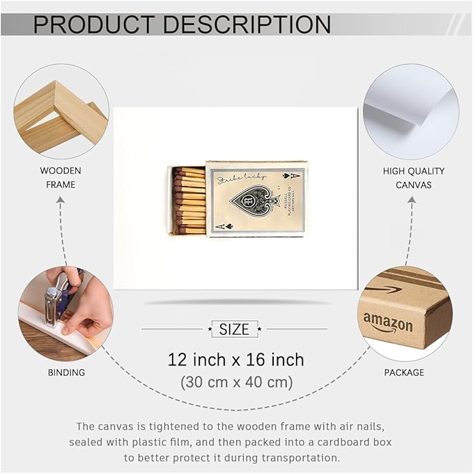 Retro Matches Poker Canvas Posters Vintage Ace of Spades Playing Cards Matchbox Wall Art 12x16 inch Framed Trendy Preppy Wall Decor Funky Aesthetic Prints for Living Room