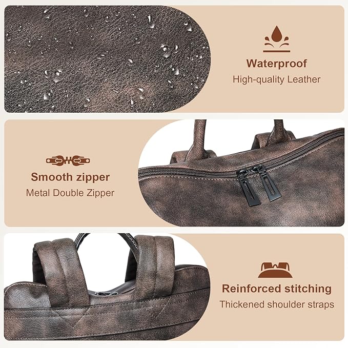 - 【Leather Laptop Backpack for Women】:Laptop backpacks made of soft and durable faux leather and fabric lining,thick shoulder straps,unique leather handles,no-slip zippers.The heavy-duty laptop backpack women features a total of 2 compartments and 11 pockets,making it easy to organize all work necessities,college supplies,and travel essentials,with dimensions of 16.5" x 15.7" x 7.8" and a weight of 2 lbs