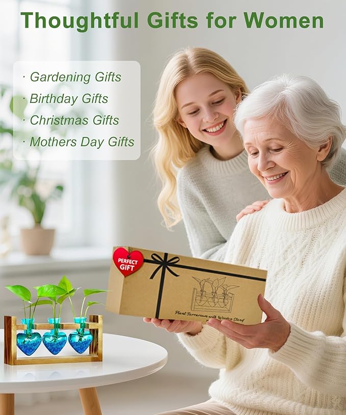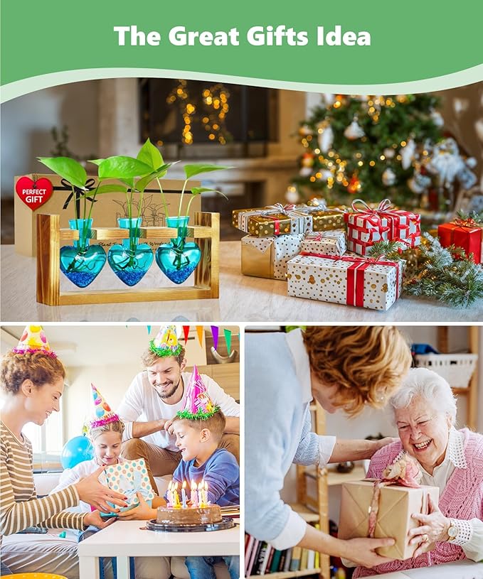 Nacome Plant Terrarium for Office Decor: Birthday Gifts for Plant Lovers Women Mom Wife - Wooden Stand Tabletop Planter 3 Bulb Glass Vase Heart Shaped for Hydroponics Indoor Home