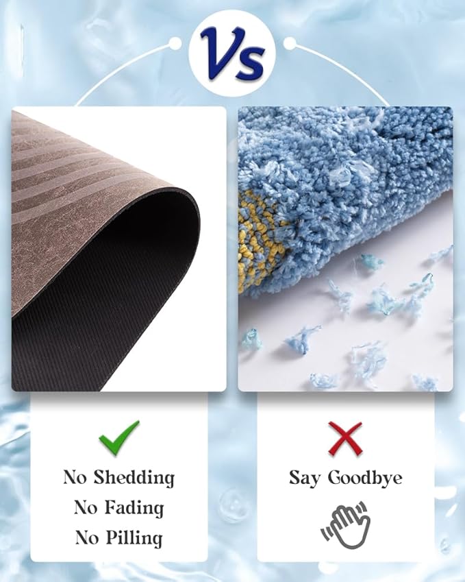 - DURABLE:These bathroom mats are designed with a Faux suede surface. You will never be bothered by fiber dropping or fuzzy pilling problems like traditional chenille bathroom floor mats. Therefore, this bath rug is much more durable without problems caused by fibers, like shedding, fading, wearing, dirt or hair hiding