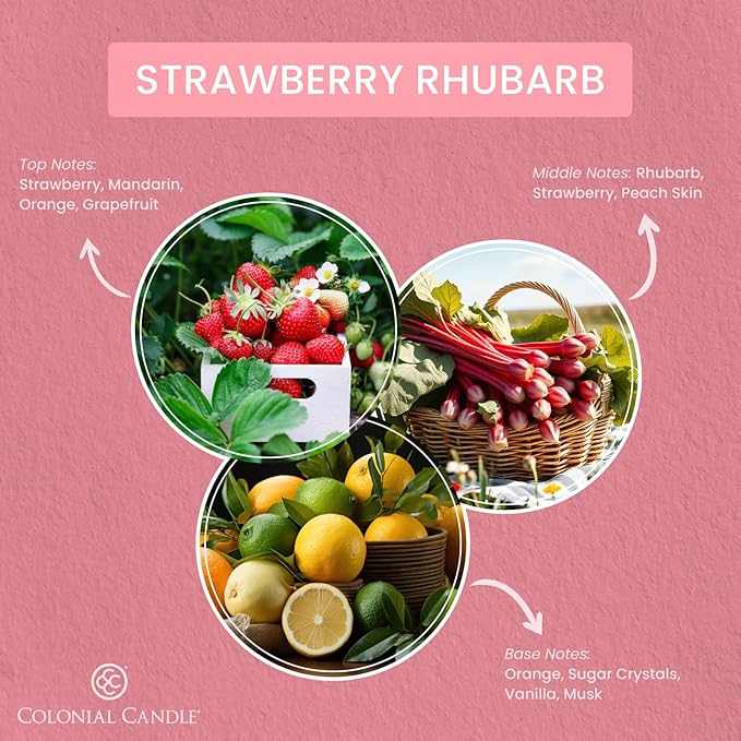 - Strawberry Rhubarb: Nothing says warm weather like crisp citrus fruits! Fresh Strawberry Rhubarb is packed full of zesty fruits like mandarin, grapefruit and strawberry. With hints of rhubarb and musk, this fragrance is a must for your warm weather routine!