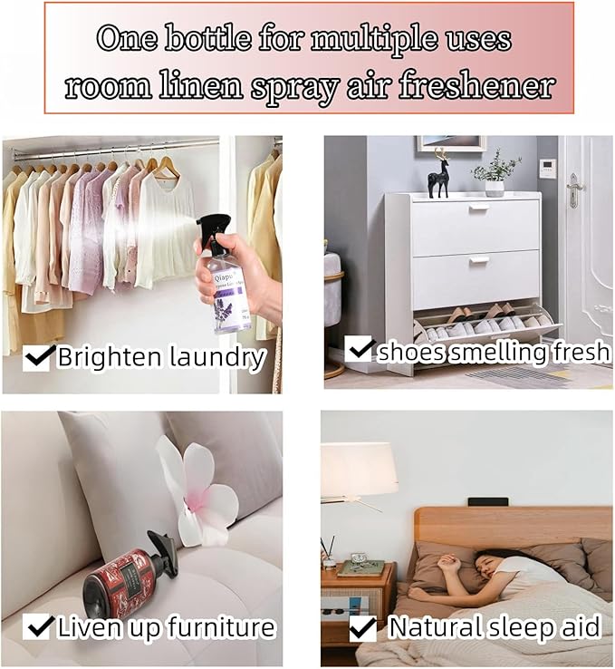 - Versatile Use Across Multiple Surfaces Our Linen & Room Air Freshener Spray is designed for versatile use. Perfect for spritzing on bedding, pillows, sheets, upholstery, and fabrics, it also doubles as an air freshener to enhance any room. Whether you're freshening your linens, refreshing your sofa, or adding a calming scent to your home office, this set meets all your fragrance needs.