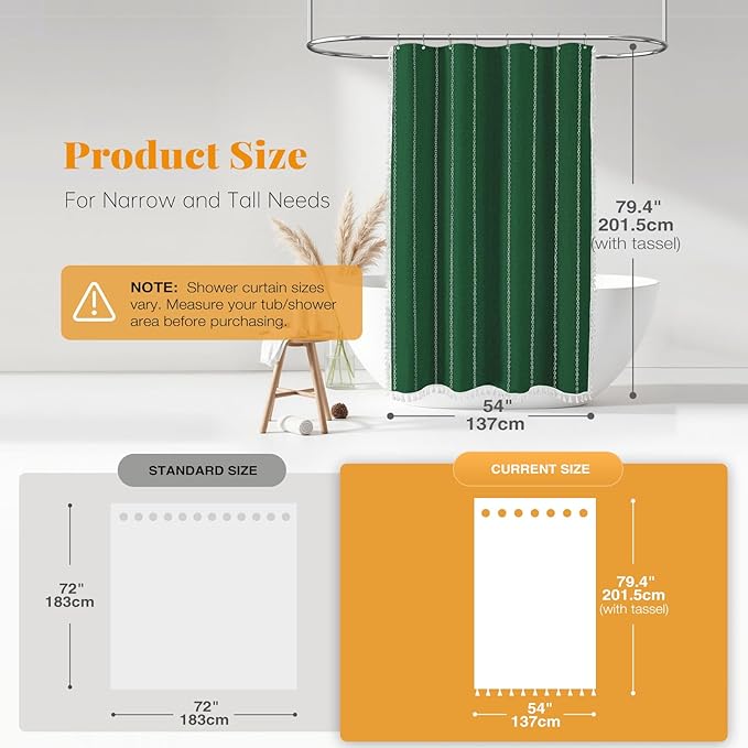 - 【Dimensions】: W54xH78 inches(The tassel length is not included); ❤️The tassel brings 1.4 inches of additional length❤️; Package includes 1 emerald green shower curtain and ★10 plastic hooks★; Various sizes shower curtains meet most bathtubs and shower stalls need. This farmhouse shower curtain is ideal for various settings, including apartments, hotels, spas, RVs, dorms, schools, athletic clubs, gyms, and more. It can be used anywhere a shower curtain is needed.