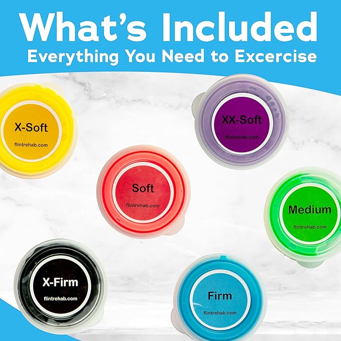 - Different Firmness Levels for Hand Rehab - This set includes six color-coded putties with varying firmness levels: XX-soft, X-soft, Soft, Medium, Firm & X-firm. These levels allow for personalized hand therapy, making it suitable for all ages and strength needs.