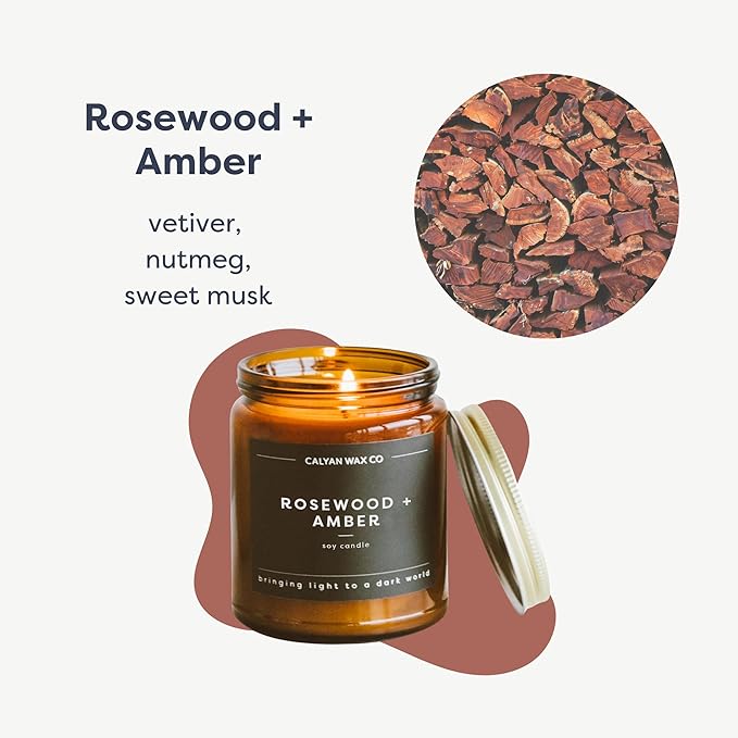 Calyan Wax Co. Soy Wax Candle, Rosewood + Amber Scented Candle, 57 Hour Burn Time, Aromatherapy Soy Candles, Non Toxic & Vegan Soy Wax, Amber Glass Jar Scented Candles, 7.2oz