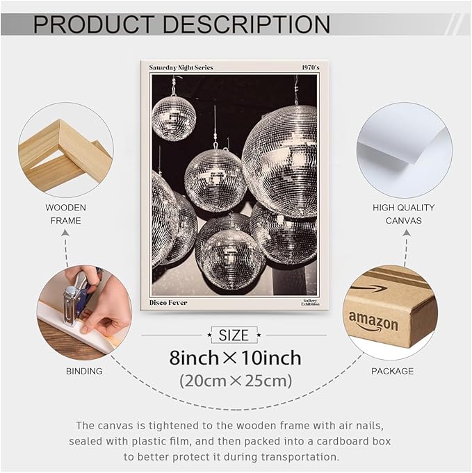 - Retro Wall Art:Black and white poster size are 08x10 inch,this disco ball wall art are wrapped and stretched over wood frame.Ready to be hung directly,you can create a fashion and vibrant atmosphere