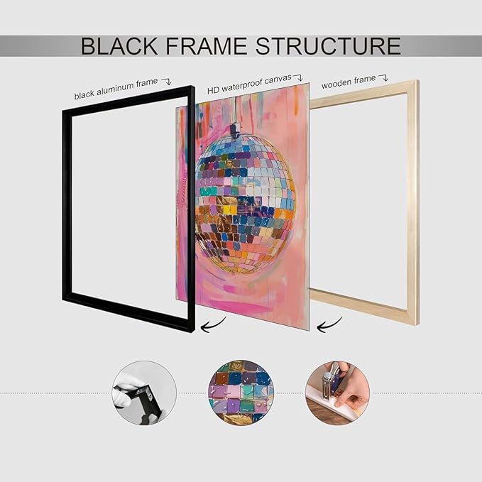 - Y2k Posters:Preppy wall art size is 16x24 inch.Disco ball wall art is wrapped and stretched in a wood frame and set in a black aluminum frame.The black frame also adds some modernity and style to the poster