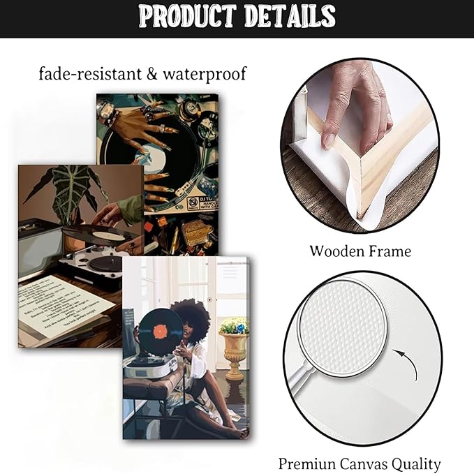 Framed Black Girl Canvas Wall Art 3Pcs black Girl Record Music Wall Decor Pictures Funky Black Girl Posters prints for Modern Black Woman Bedroom Home Decoration 12x16in