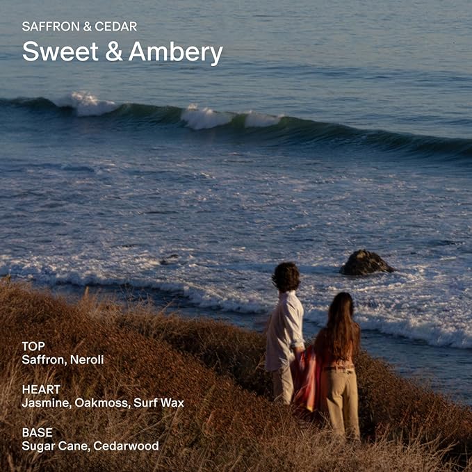 - Iconic Scents — Saffron & Cedar is sweet, warm, and ambery—like taking a drive up the Pacific Coast where the ocean meets the mountains.