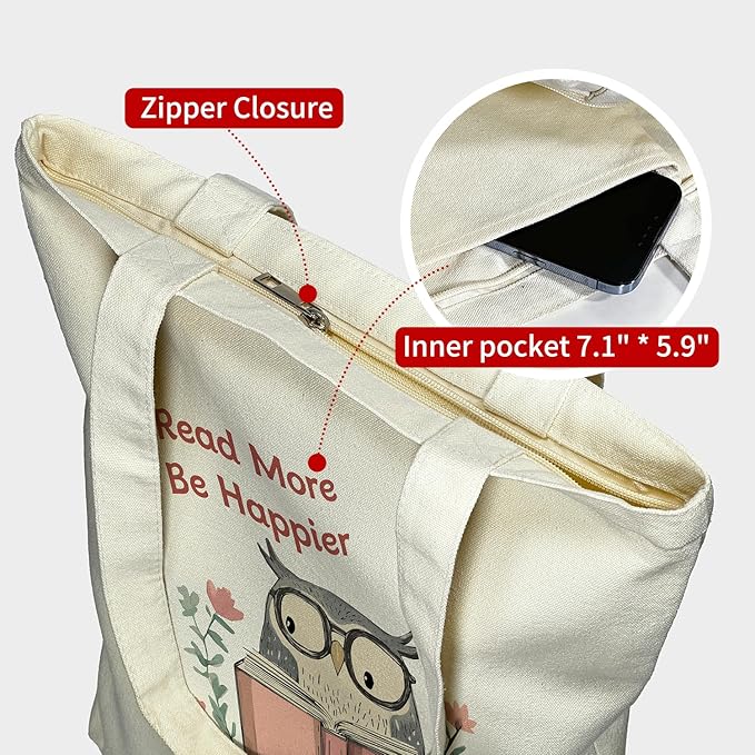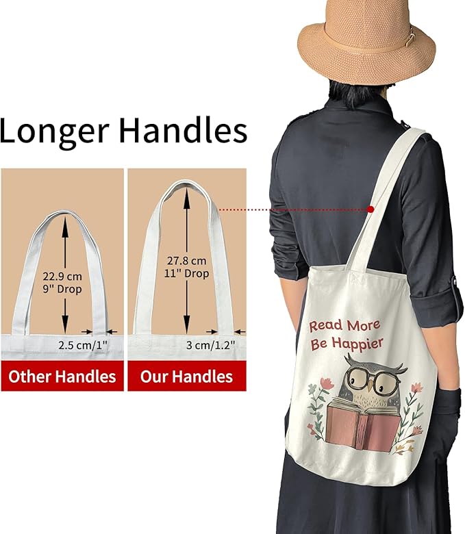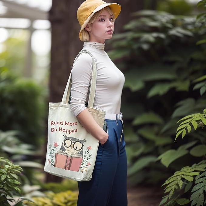 - Canvas Tote Bag for Women: This beautifully printed tote bag features the inspiring phrase “Read More, Be Happier” along with an adorable owl pattern. It's the perfect gift for book lovers, bookworms, readers, librarians, authors, or anyone who appreciates literature. Ideal for gifting to best friends, girlfriends, sisters, daughters, colleagues, or book club members.