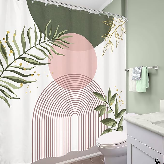 Green Pink Boho Shower Curtain 72Wx72H Modern Bohemian Abstract Sage Green Gold Leaves Plant Botanical Minimalist Bathroom Decor Geometric Neutral Bath Curtain Fabric Polyester 12 Pack Hook