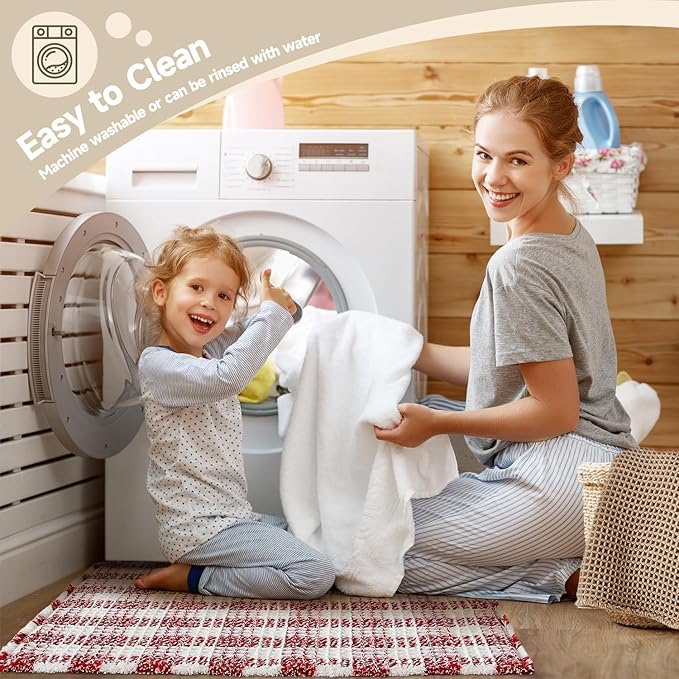 Waffle Bath Mat, Boho Bathroom Rugs Non Slip Washable Absorbent Checkered Bathroom Mat Quick Dry Cute Bath Mat, 36"x24" Red and White