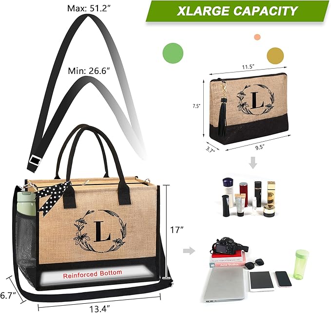 - PERSONALIZED GIFTS & MULTI-USE: The personalized initial tote bag is a unique gift for your mom, sisters, friend, coworkers, teacher, hostess, bride, bridesmaids, employee.When it comes to Valentine's Day,Mother's Day,Teacher's Day. Our monogrammed tote bags makes your gift even more special. You can use this initial tote on many occasions,such as a work bag, travel bag, beach bag, holiday gifts, birthday gift, retirement gift, thank you gifts, relaxation gifts, holiday gifts.