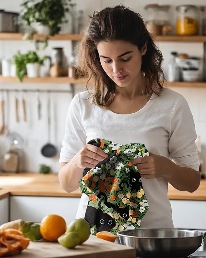 Microfiber Kitchen Towels - Set of 2 Dish Towels for Kitchen 18 x 26 Inch Home Decoration Cat Flower Cute Spring Hand Towels Soft & Absorbent Aesthetic Design