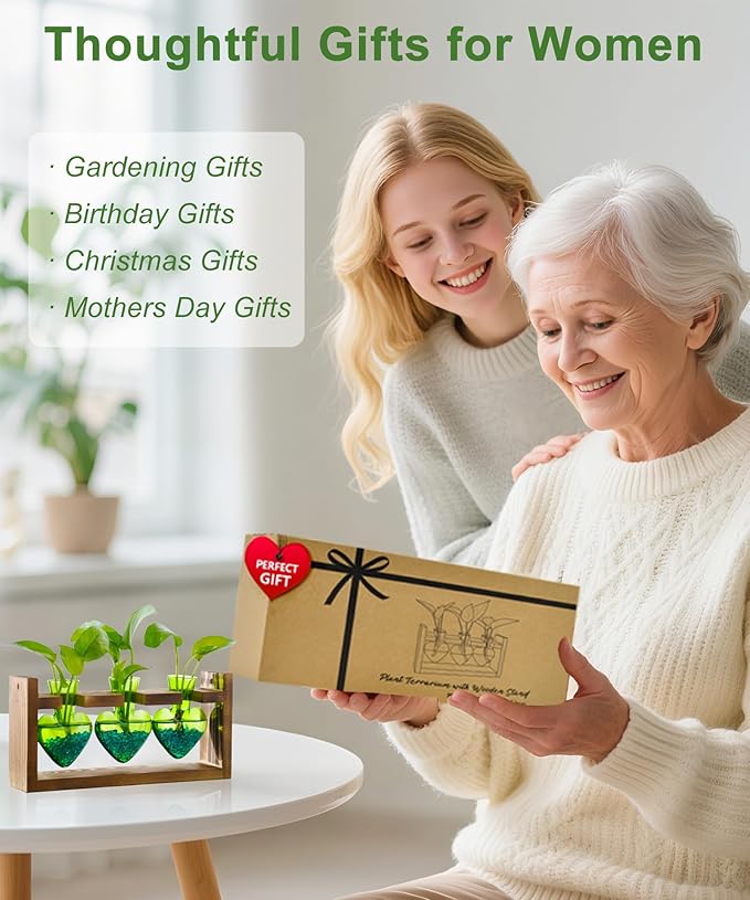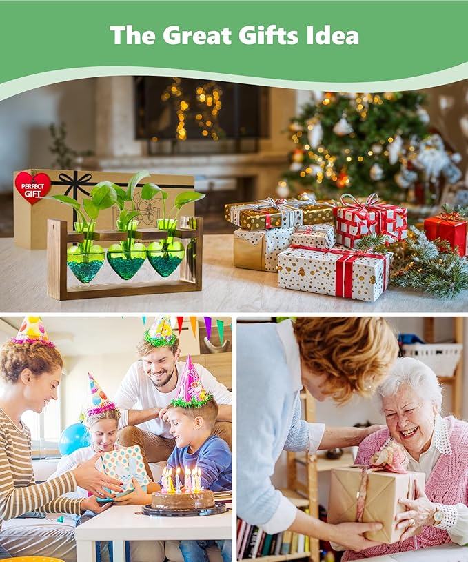 Nacome Plant Terrarium for Office Decor: Birthday Gifts for Plant Lovers Women Mom Wife - Wooden Stand Tabletop Planter 3 Bulb Glass Vase Heart Shaped for Hydroponics Indoor Home(Green)