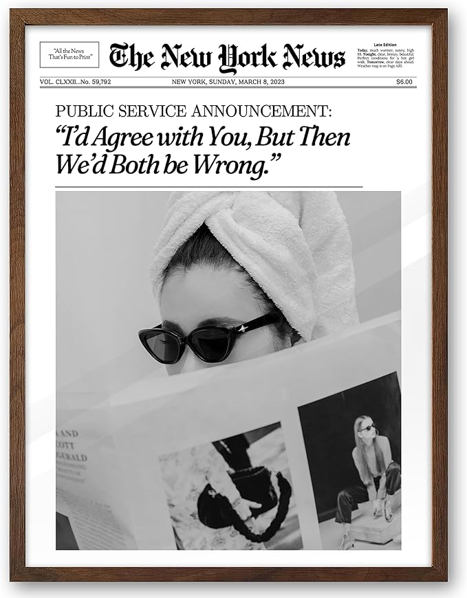 EcoHest Trendy Newspaper Framed Wall Art, 12x16 in OAK Wood Walnut Color Cool Girl Canvas Art, Magazine Bar Cart Print College Dorm Decor, Set of 1 for Bedroom Living Room