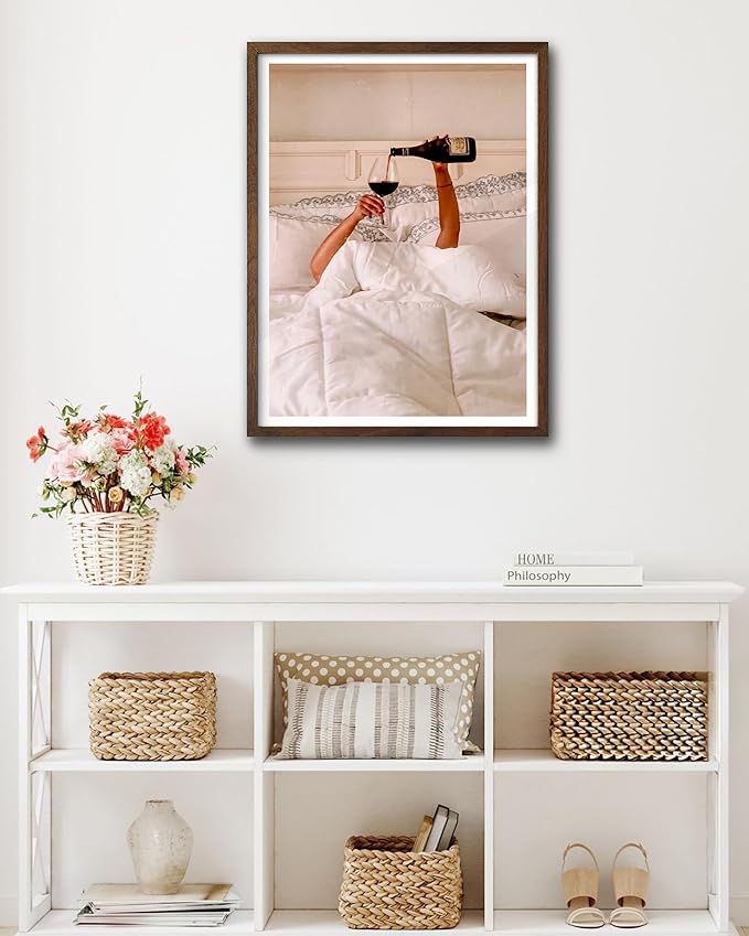 EcoHest Woman Drinking Wine in Bed Framed Wall Art Walnut Color, 12x16 in OAK Wood Feminist Alcohol Canvas Art, Trendy Teen Girl Bar Cart Print College Room Decor Set of 1 For Bedroom Living Room