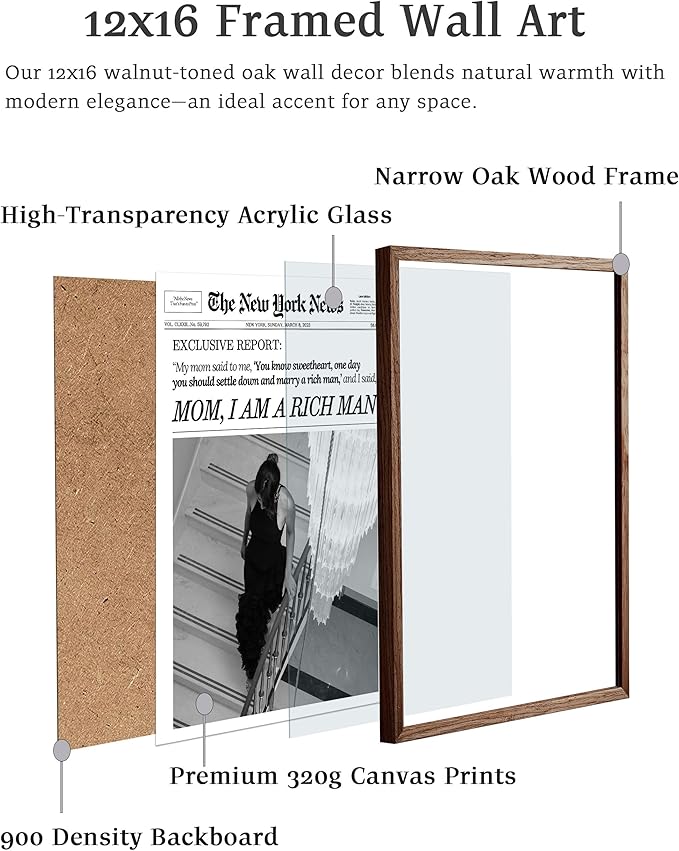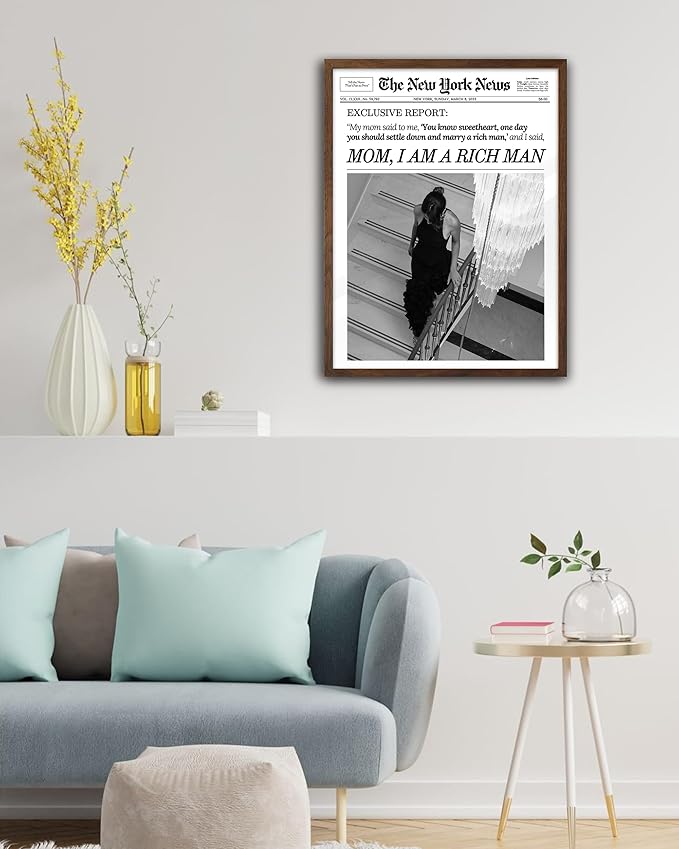 EcoHest Trendy Newspaper Framed Wall Art, Walnut Color 12x16 in OAK Wood Mom I Am a Rich Man Canvas Art, Magazine Girly Poster College Dorm Decor, Set of 1 for Bedroom Living Room