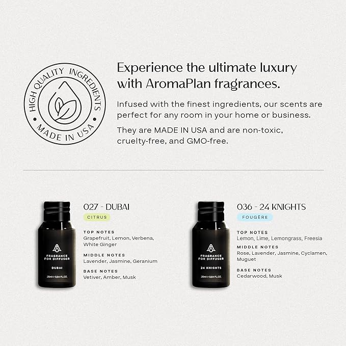 - TWO LUXURIOUS WATERLESS PLUG-IN DIFFUSER WITH 2 FRAGRANCES – The AromaPlan Authentic 2025 Upgraded Plug-In Diffuser uses advanced NT10x nanotechnology to transform liquid fragrance into dry, vaporous microparticles, evenly scenting spaces up to 500 sq ft without water or oily residue. This set includes 2 Plug Ins + 2 bestselling 25ml fragrances—Dubai & 24 Knights—delivering fresh, invigorating scents.