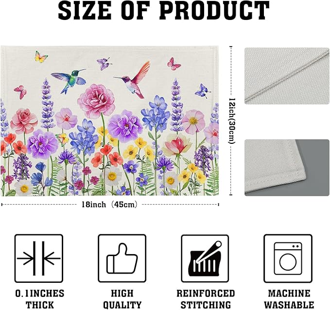 Giwawa Hummingbird Flower Placemats Set of 4, 12"x18" Watercolor Spring Herb Floral Table Mats, Wildflower Botanical Stain Resistant Washable Linen Place Mat for Kitchen Dining Party Decor