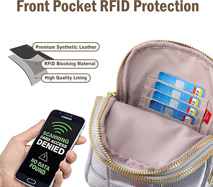 - 【RFID Blocking】The front zipper pocket of this rfid blocking bag has four card slots built inside, which are made of proprietary shielding materials. These card slots can effectively block RFID signals and protect your personal cards from unauthorized access. You can rest assured that your credit card information will be kept safe when you're traveling or shopping.