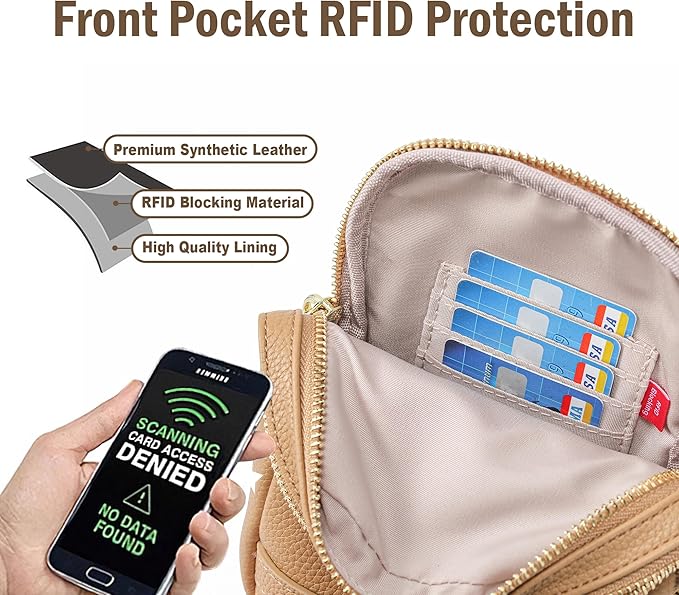 - 【RFID Blocking】The front zipper pocket of this rfid blocking bag has four card slots built inside, which are made of proprietary shielding materials. These card slots can effectively block RFID signals and protect your personal cards from unauthorized access. You can rest assured that your credit card information will be kept safe when you're traveling or shopping.