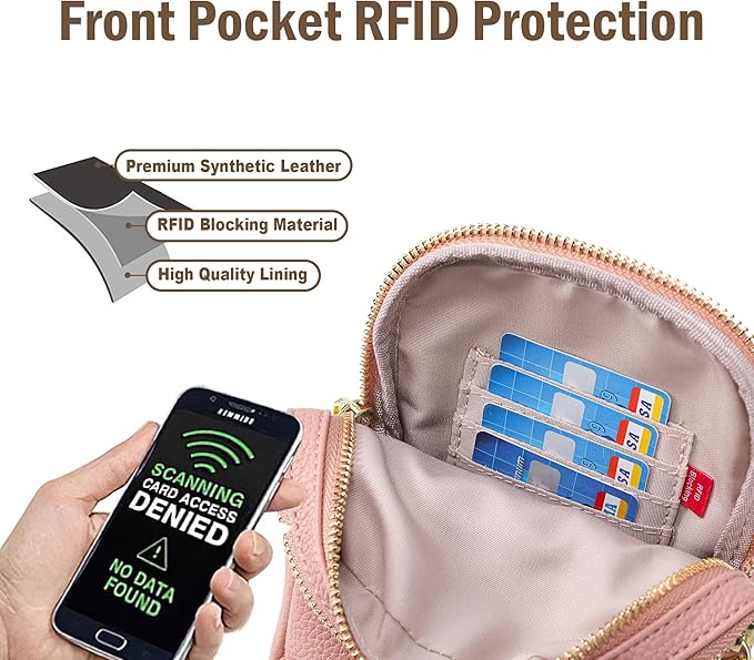 - 【RFID Blocking】The front zipper pocket of this rfid blocking bag has four card slots built inside, which are made of proprietary shielding materials. These card slots can effectively block RFID signals and protect your personal cards from unauthorized access. You can rest assured that your credit card information will be kept safe when you're traveling or shopping.