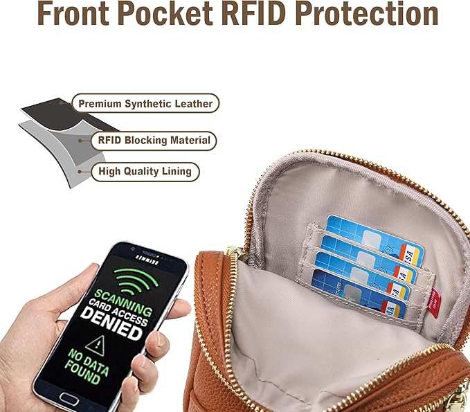 - 【RFID Blocking】The front zipper pocket of this rfid blocking bag has four card slots built inside, which are made of proprietary shielding materials. These card slots can effectively block RFID signals and protect your personal cards from unauthorized access. You can rest assured that your credit card information will be kept safe when you're traveling or shopping.