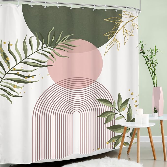 Pink Green Boho Shower Curtain 72Wx84H Extra Long Bohemian Mid Century Modern Abstract Sage Green Gold Leaves Plant Minimalist Bathroom Decor Arch Bath Curtain Fabric Polyester 12 Pack Hooks