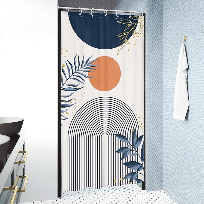 Small Stall Boho Shower Curtain 36Wx72H Navy Blue Modern Bohemian Mid Century Gold Leaves Orange Minimalist Geometric Bathroom Decor Half Narrow Bath Curtain Fabric Polyester 7 Pack Hooks