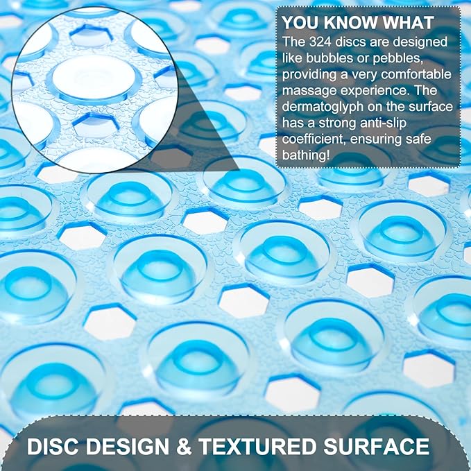 - ULTIMATE SAFETY & COMFORT: Designed with 324 pebble-like discs, this bath mat offers a luxurious, massaging experience while you shower. Our leather-textured surface ensures reliable non-slip traction, giving you peace of mind whether you're bathing babies, toddlers, seniors, or pets.